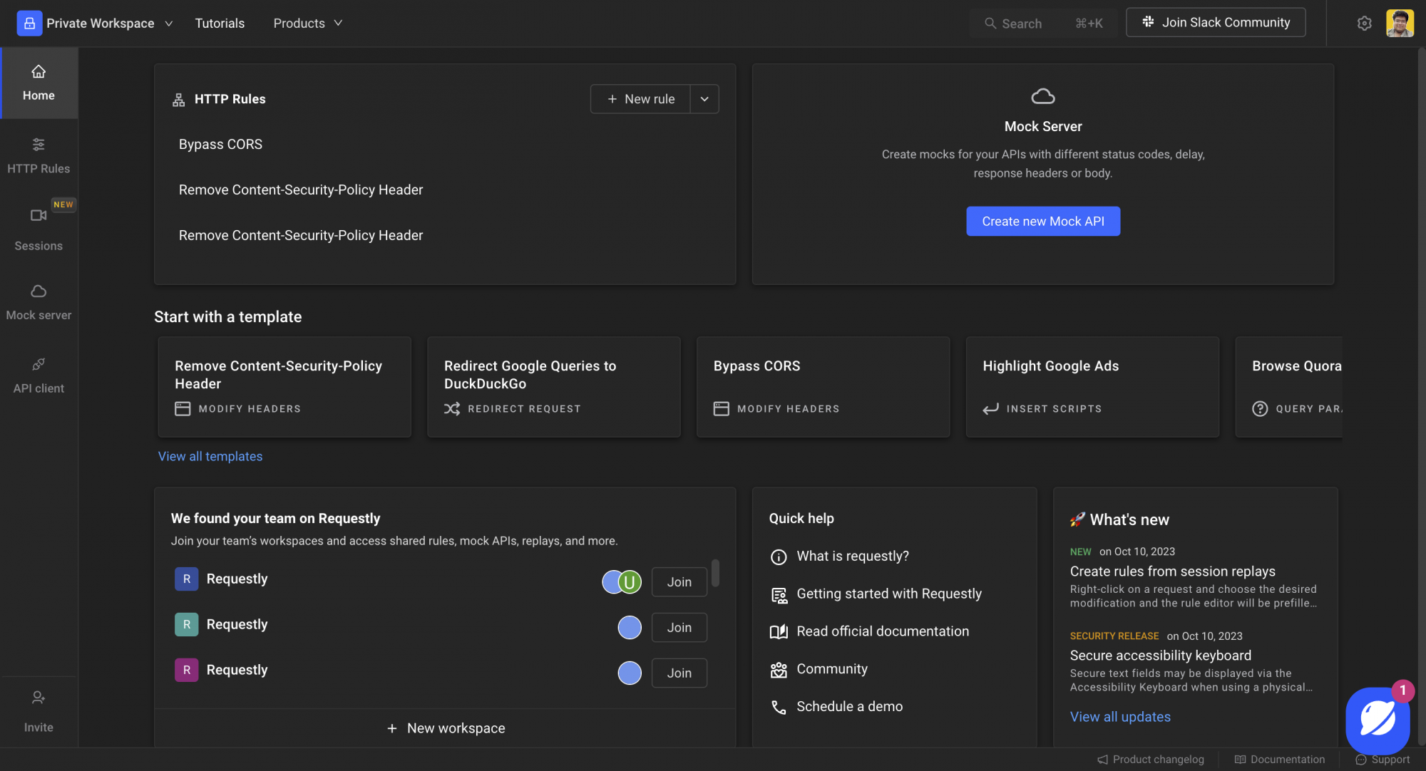 It features sections for HTTP rules, mocks, templates, and workspace-related information, as well as help links and a "Whatβs New" section to keep users informed about the latest updates and releases.
